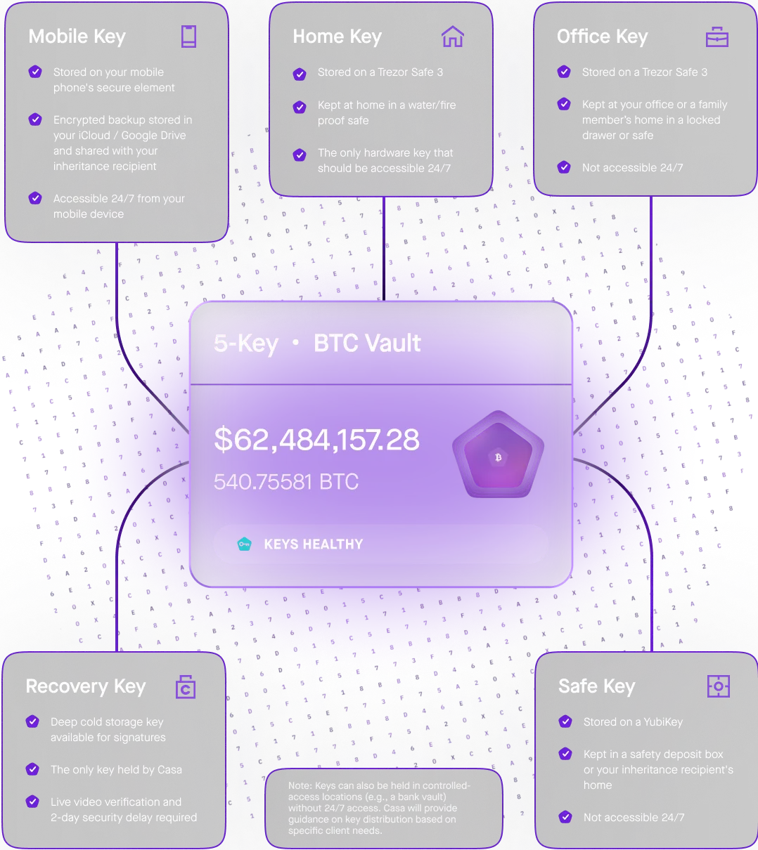 Casa holds one key on your behalf to aid with recovery if one of your keys are compromised, and we offer varying levels of support to assist you with replacing a key. This means that while you’re holding your keys, you’re not completely shouldering the security risk of securing wealth on your own.